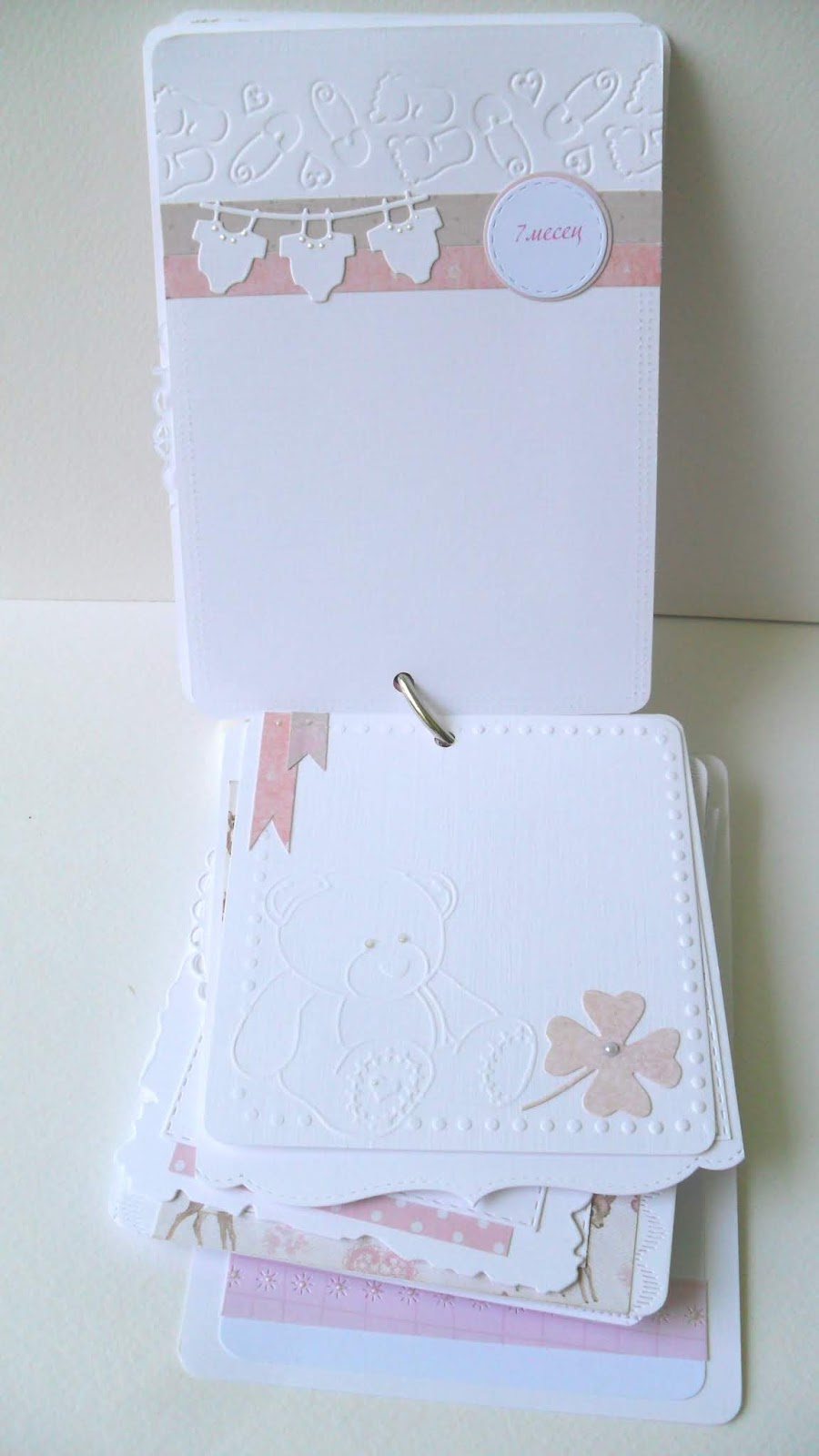 Обичам да правя бебешки красоти по всякакви поводи . На пазара има невероятно красиви дизайнерски хартии с подходящи мотиви и макар да съм си забранила да купувам повече такива, трудно им устоявам.За този комплект за новородено момиченце използвах прекрасните хартии от една стара колекция на ScrapBerrys.